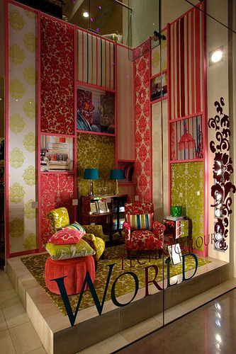 To create an attractive window display in this fashionably exclusive furniture store, we laminated samples of wallpaper to panels of MDF to help create this unique look.