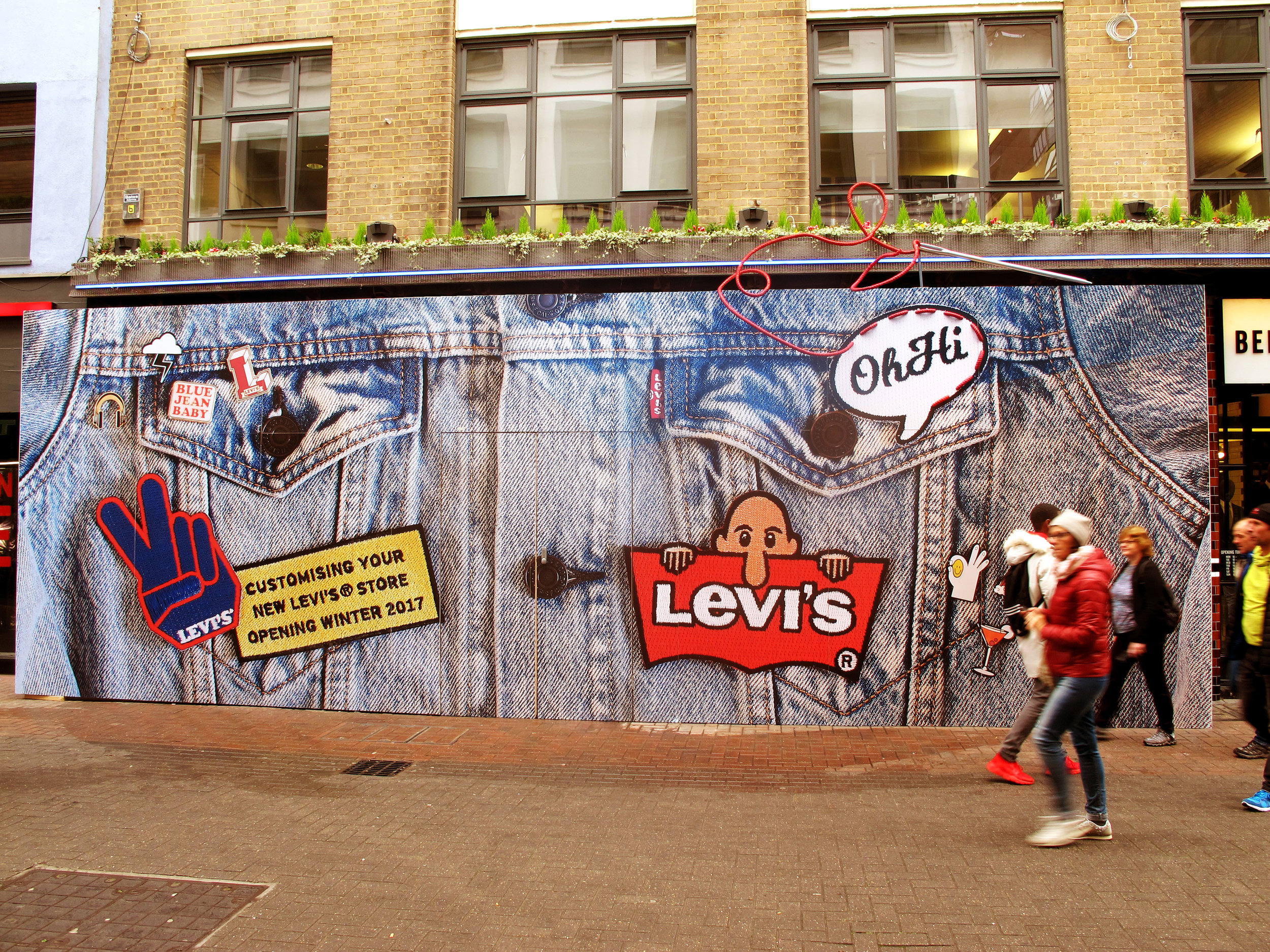 Large hoarding, printed in sections. 3mm Amari board which was then bonded onto plywood, before being constructed over the shopfront in Carnaby Street.