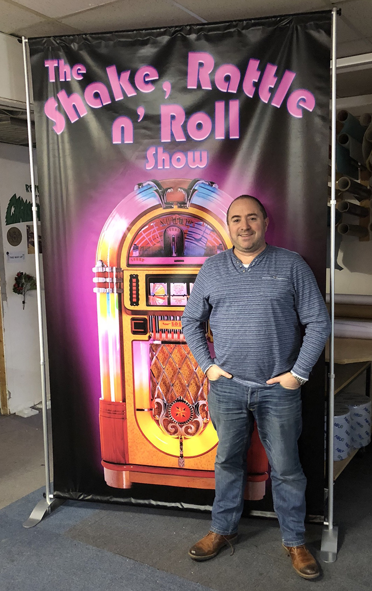 The clever telescopic construction of this lightweight backdrop system, proved the ideal solution for a couple of talented performers who wanted a portable stage set for their Shake Rattle n’ Roll show, which they are touring the Balearic Islands with this summer.
