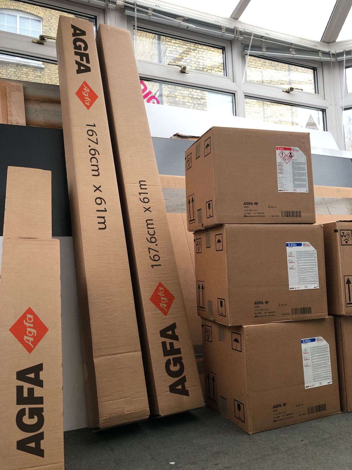 An exciting delivery arrived today, fresh off the boat from Belgium – a consignment of extra large 1676mm wide film. Meaning we can once more offer film positives up to 4500 x 1600mm in one piece. Something we haven’t been able to offer since February this year.