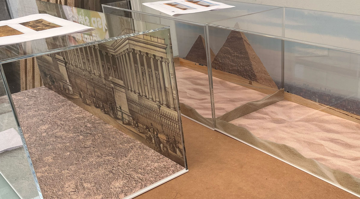 The cases will be used to display jewellery in the gift shop and will be visible from behind as well as the front, which is why the stickers needed to be double sided. The sand dune effect on the pyramid displays also needed to be CAD cut to shape before installation. We also printed the detailing on the small plinths that will be placed in the display cases to hold the trinkets and jewellery.