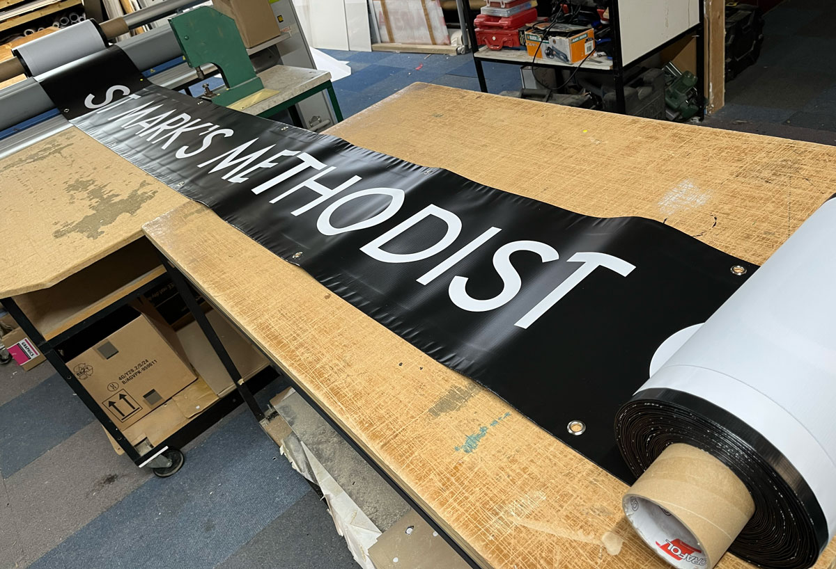 This is the longest banner we’ve ever printed. Our customer PAYE needed a long thin banner with hems and eyelets to hang along the scaffolding they had erected around St Mark’s Methodist Church during renovation.